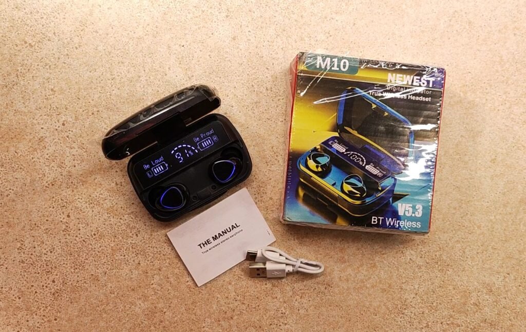 Upon receiving the Bluetooth Headset M10, the first noticeable aspect is its sleek packaging. The box is compact yet professional, offering a sense of quality from the very first touch. Inside, you will find the headset, a sturdy charging case with LED display, a USB charging cable, and a user manual.